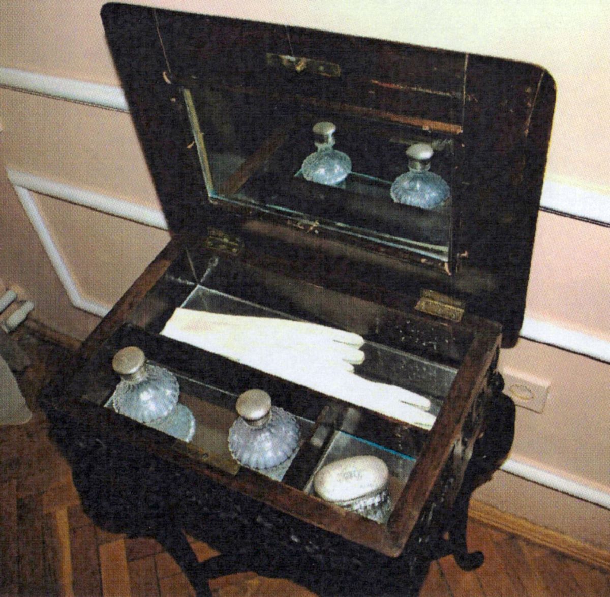 Descriere: Pudrieră de formă ovală, ornamentată, face parte dintr-o trusă de toaletă a Adelei care mai conține și două flacoane de cristal cu capac de argint pentru parfum, o oglindă de mână și o oglindă de masă cu ramă de argint. Capacul din argint al pudrierei (58 g) prezintă încrustată monograma A.G.S. - Adela (Aglaia) Grigore Sturdza (nora lui Kogălniceanu, căsătorită cu fiul său, loan). Adela a fost străbunica lui Alexandru I. Kogălniceanu. Inscripție marcată, marcajul se prezintă sub forma unei rozete cu 5 petale și înscrisul P.S. pe partea interioară a capacului. A aparținut familiei Kogălniceanu și provine de la stră-strănepotul Alexandru I. Kogălniceanu (1941-2003). Mihail Kogălniceanu a fost prim-ministru al României după Unirea din 1859, ministru al Afacerilor Externe sub Carol I, politician de orientare liberală, avocat, istoric, scriitor publicist, originar din Moldova.