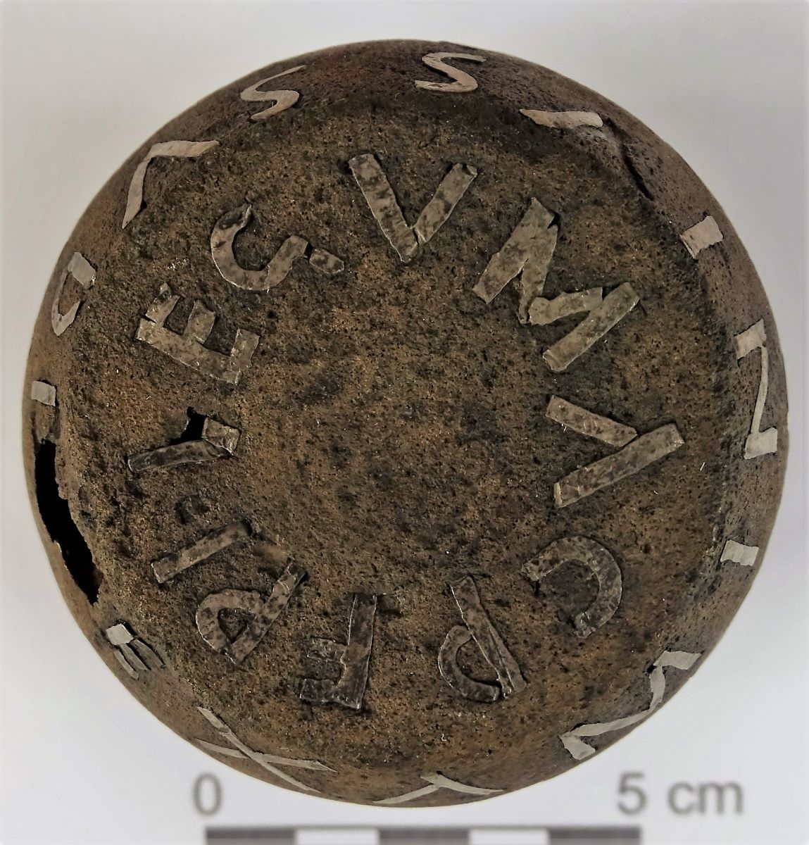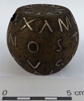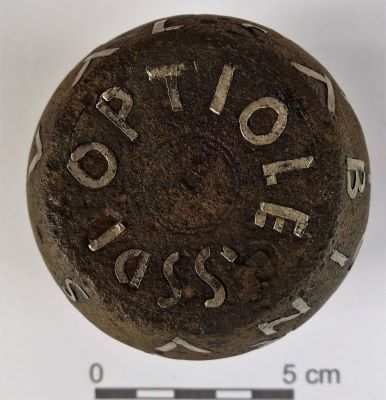 Descriere: Greutate verificată de cântar (pondus examinatus) de forma unui butoiaș, având carcasa de bronz, cu patină maronie și interiorul umplut cu plumb lichid. Pe suprafața carcasei s-a aplicat o inscripție cu litere de argint, care începe pe suprafața plată de sus, continuă cu patru rânduri pe suprafața rotundă și se sfârșește pe suprafața plată de pe fundul piesei. Literele tăiate dintr-o tablă de argint groasă de 0,5 mm au fost introduse în spațiile gravate anterior pe suprafața bronzului, surplusul fiind îndepărtat cu dalta. Înălțimea literelor este de 0,5 - 1,1 cm. Între unele cuvinte se află puncte despărțitoare. Inscripția menționează că greutatea a fost verificată la ordinul celor trei împărați Septimius Severus, Caracalla și Geta (209-211 sau eventual 198-211), optio Valerius Sabinus fiind probabil cel care a achitat valoarea pieselor. Pondul a fost descoperit într-un strat de cenușă, indicând un foc intenționat, suficient de puternic pentru a face să se scurgă plumbul din interiorul pondului prin spărtura din carcasa de bronz. Probabil că spărtura a fost executată intenționat, plumbul scurs și solidificat fiind găsit alături. Conform sistemului ponderal propriu castrului potaissens greutatea inițială a pondului era de 896 grame. Carcasa de bronz a fost umplută cu plumb lichid pe balanță, până când pondul a căpătat greutatea necesară. Câteva litere lipsesc, fiind căzute de la locurile lor. Lipsesc toate punctele de marcare, iar decorul din jurul punctelor nu se mai observă. O spărtură pe suprafața bronzului a distrus a doua literă D din rândul 3.