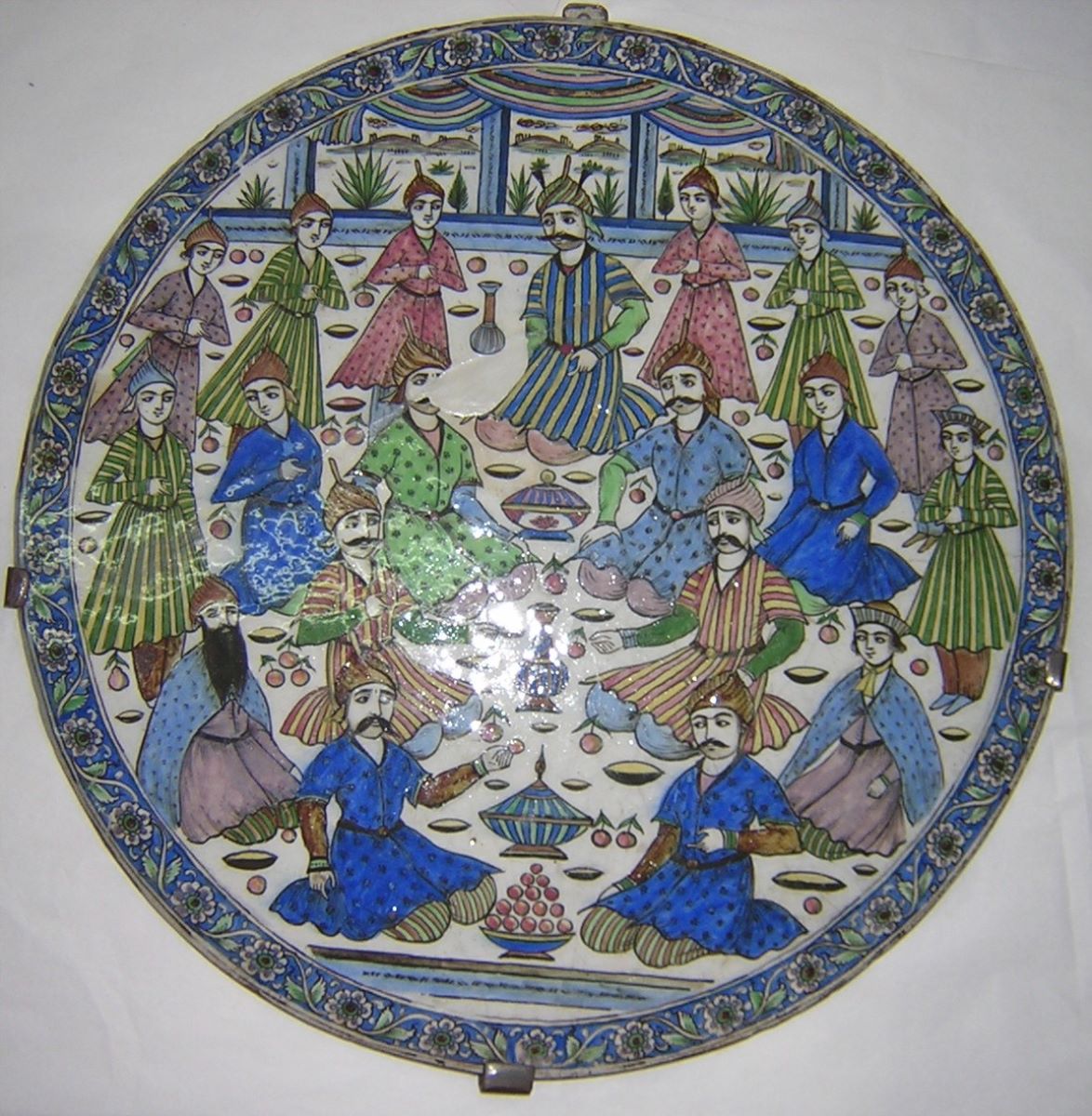 Descriere: Placă circulară folosită ca blat de masă. Pe fond alb, scenă de banchet cu 19 personaje, unele în picioare, altele așezate. Câteva personaje poartă turban cu baghetă, de tipul celor din epoca lui Shah Tahmasp (secolul al XVI-lea). Pe jos, vase și fructe. Scena se desfășoară într-un interior, lucru sugerat de deschiderea spre peisaj din partea de sus. Draperie deasupra ferestrelor. Chenar decorativ pe fond albastru, cu vrej floral.
