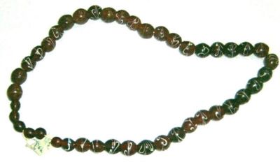 Descriere: Șirag de mărgele format din șase mărgele mici, colorate vișiniu, iar restul din mărgele mari, de aceeași culoare, cu desen floral, alb și galben. Șirag cu 43 de mărgele înșirate.