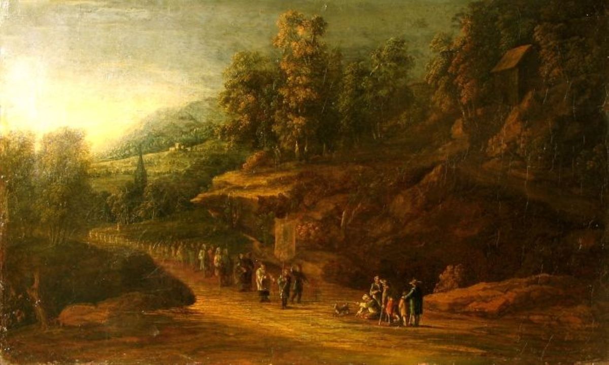 Descriere: Un gol în avanscenă (brunuri), și apoi în centru-dreapta, pe marginea unui drum câteva siluete umane și un copil, un câine (brun, roșu, alb, gri). Pe drumul ce deschide o perspectivă spre fundal, un lung șir de oameni, siluete ce se înșiră până în fundal, redate în alb, gri, brun, roșu, albastru, verde, iar în fața lor, un preot și alți doi inși ce duc un prapur. Procesiunea religioasă trece pe lângă un deal pietros, pe care se vede o casă de lemn (dreapta-sus) și câțiva copaci, totul redat în dominantă de brun cu accente de verde și oranj, în dreapta compoziției. Spre fundal, în centru-stânga, turnul ascuțit al unei biserici (brun, gri, verde, oranj), apoi în depărtare, pantele unui deal pe care se zărește o ruină de castel și munții în zare (verde, gri, alb, oranj). În stânga compoziției, pe o margine joasă de deal, apar doar câțiva copaci și cerul deasupra lor (brun, verde, albastru, oranj, griuri).