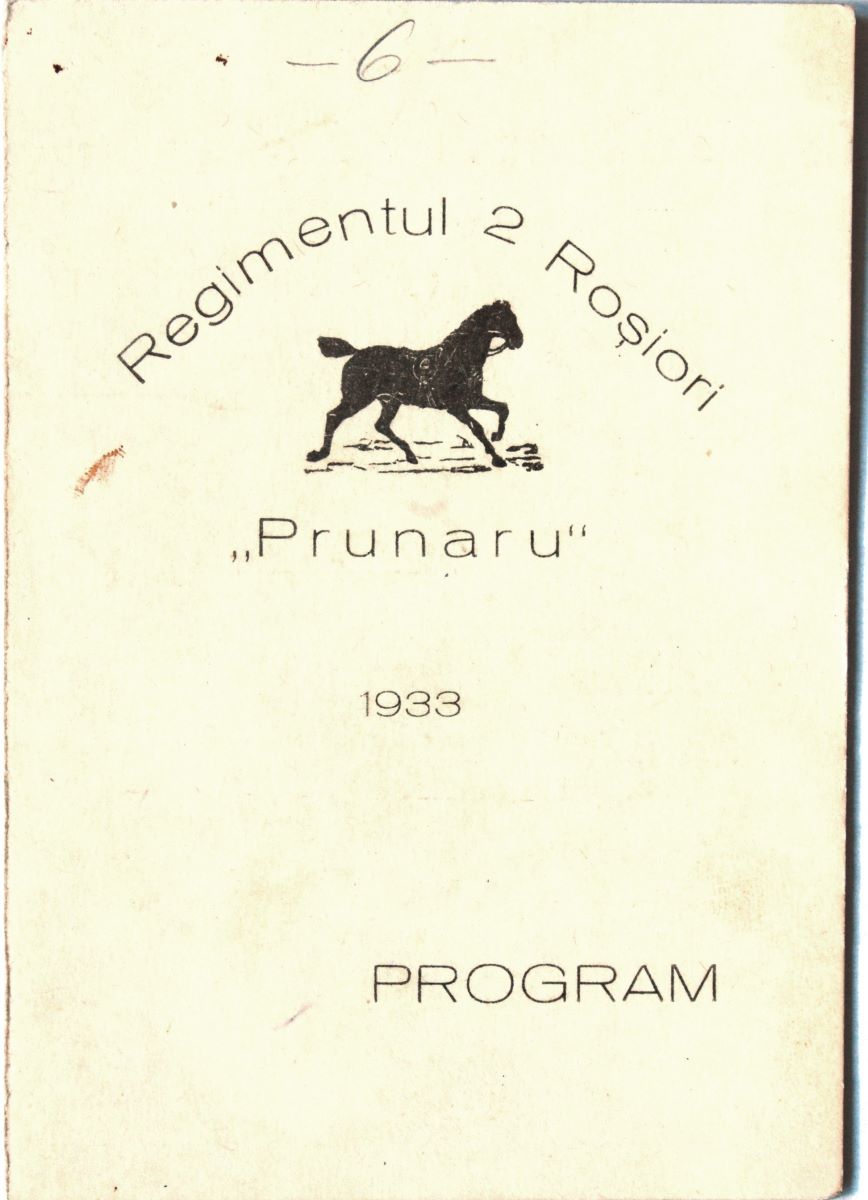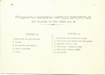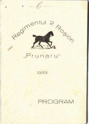 Descriere: Programul tipărit cu text argintiu se referă la serbarea hipico-sportivă a Regimentului 2 Roșiori „Prunaru” din Garnizoana Bârlad. Pe prima copertă este menționat numele regimentului, anul desfășurării serbării (1933), dar și o vignetă reprezentând un cal alergând. În interior este tipărit, tot cu argintiu, programul desfășurat al serbării, din ziua de 13 mai 1933, ora 16.00. Aflăm că programul serbării s-a desfășurat în două părți; prima parte cuprindea exerciții de gimnastică, voltije, mănuiri, jocul cocardei, „Turci”, iar cea de-a doua parte cuprindea parcursul de obstacole trupă, parcursul de obstacole reangajați, elefanți tancuri, parcursul obișnuit ofițeri, parcursul special ofițeri, „carousel”. Ultima copertă este liberă. Regimentul 2 Roșiori Bârlad s-a remarcat atât prin participarea la Războiul de Independență, la al doilea război balcanic dar mai ales în Primul Război Mondial prin celebra șarjă eroică de la Prunaru. La comanda acestui regiment, de-a lungul vremii, s-au evidențiat ofițeri superiori precum Gheorghe Naumescu, Victor Dombrovski. Programul face parte din colecția locotenent colonel Mircea Tomescu.