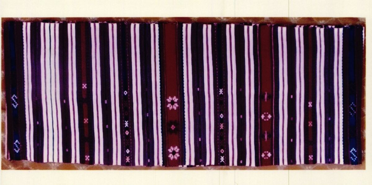 Descriere: Formă dreptunghiulară, ornamentat, pe toată suprafața, cu registre în alternanță cromatică, cu vergi de diferite lățimi, dispuse transversal. Pe vergile mai late, de culoare roșie, se află motive geometrice sub formă de cruce dreaptă și dreptunghiuri, iar vergile mai înguste de culoare neagră prezintă motive geometrice: romb și X- uri. Vărguțele de culoare roșie sunt prevăzute cu bumbi negri, iar vărguțele de culoare neagră, cu bumbi roșii. Aceste motive geometrice sunt plasate pe una din jumătățile piesei. Capetele sunt tivite. Cromatică: alb, roșu, negru, cărămiziu, galben, portocaliu.
