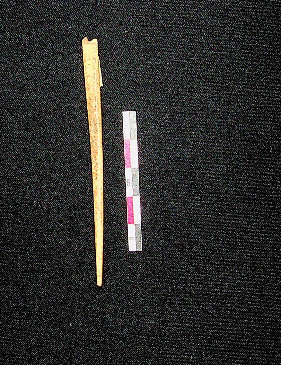 Descriere: Ac de os cu partea superioară ruptă (urechea), zgârieturi și știrbituri pe corp, vârful ciobit.