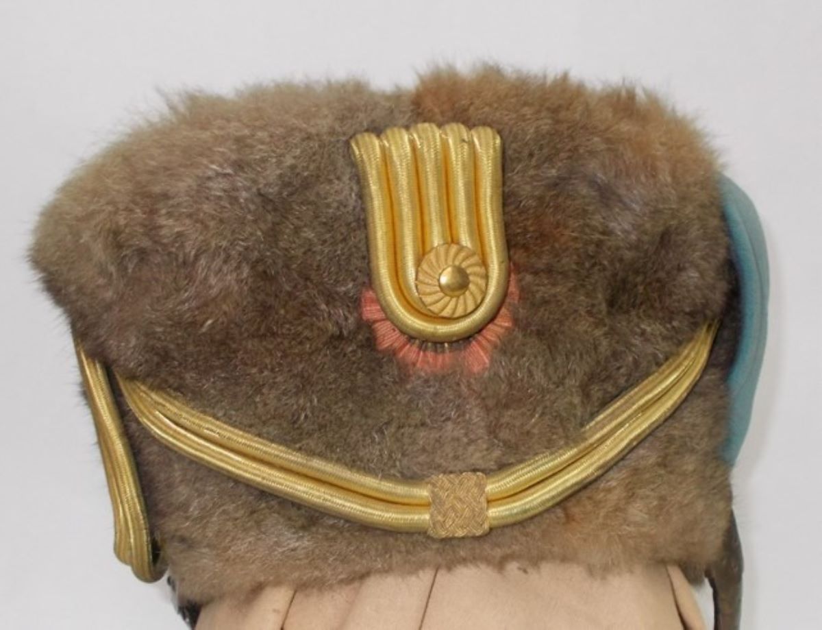 Descriere: Căciulă de blană cu calota de postav bleu fixată într-o parte de subărbie. De jur împrejur are șnur dublu din fir aurit în zigzag și cu o buclă în partea dreaptă. În față are o torsadă din fir peste o rozetă de mătase tricoloră fixată cu un nasture metalic. Subărbia metalică cu solzi și nasturi de fixare la capete. Egretă albă din păr de cal.