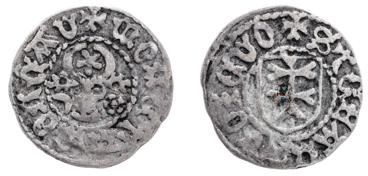 Descriere revers: Scut cu o cruce dublă, având capetele ancorate.