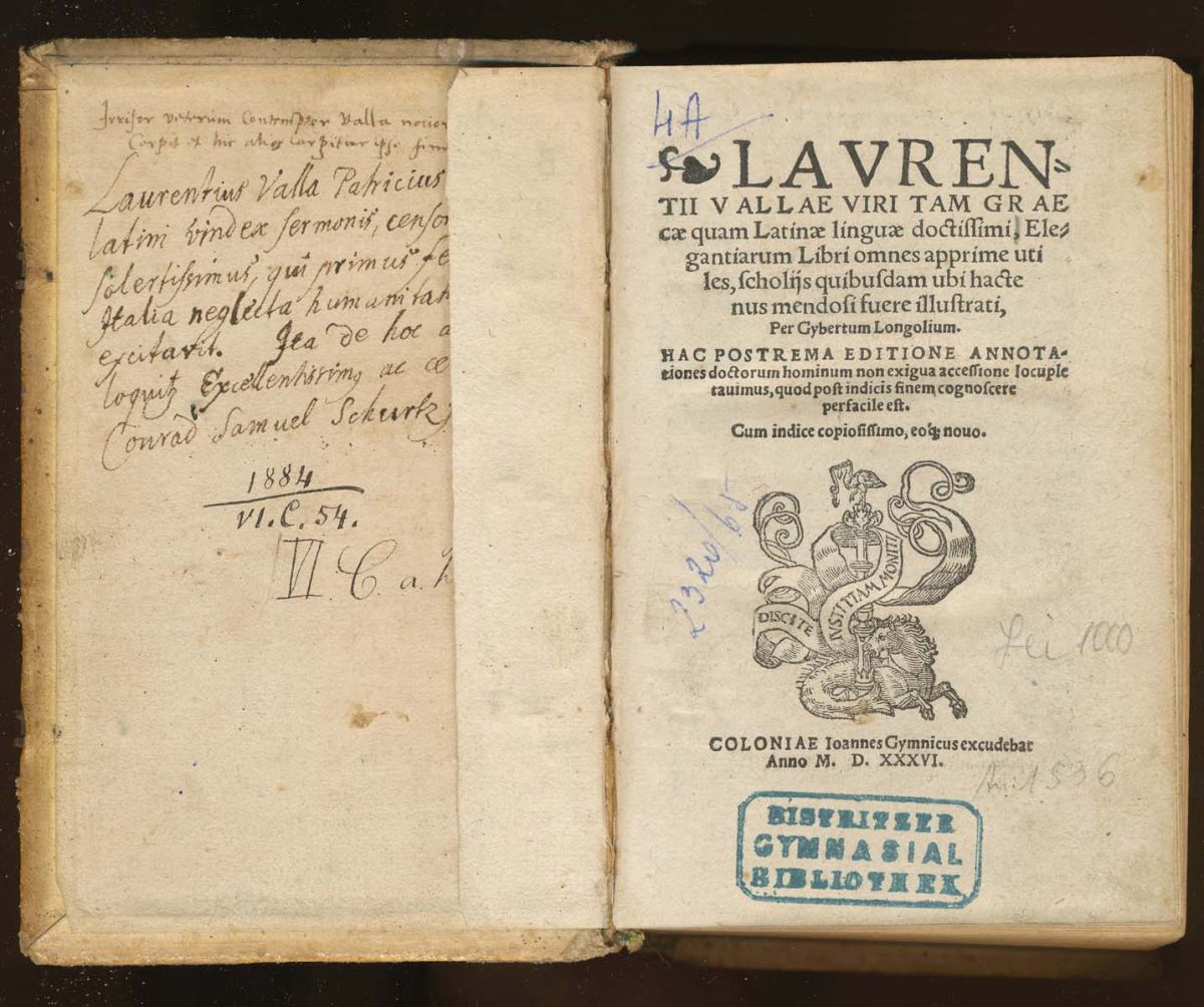 Titlu: Lavren= // tii Vallae viri tam grae // cae quam latinae linguae doctissimi, ele= // gantiarum libri omnes apprime uti // les [...]