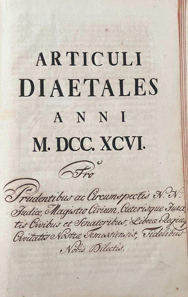 Descriere: Articuli Diaetales anni M. DCC. XCVI. „Pro Prudentibus ac Circumspectis N.N Judice, Magistro Civium, Ceterisque Juratis Civibus et Senatoribus, Liberae Regiae Civitatis Nostrae Temessiensis, Fidelibus Nobis Dilectis” (adăugire manuscrisă)