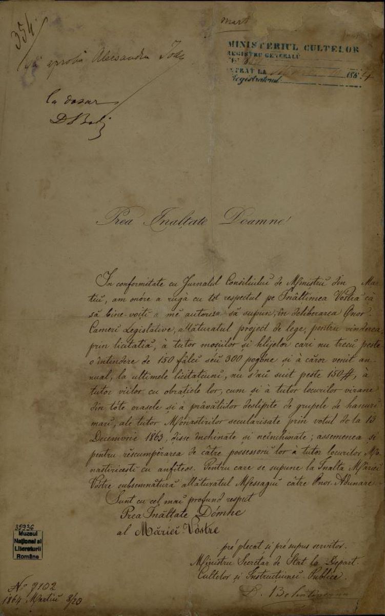 Titlu: Solicitare a lui Dimitrie Bolintineanu, ministrul Cultelor și Instrucțiunii Publice, către domnitorul Alexandru Ioan Cuza