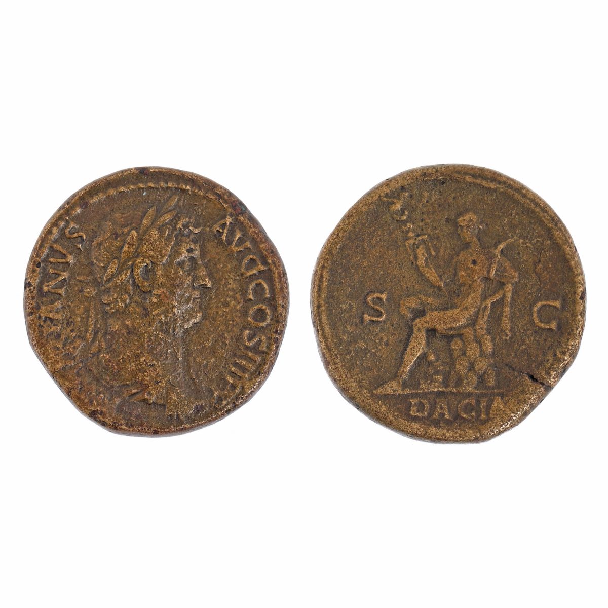 Descriere revers: Personificarea Daciei așezată spre stânga pe o grămadă de pietre, ținând un vexillum în mâna dreaptă și o sabie curbă pe umărul stâng