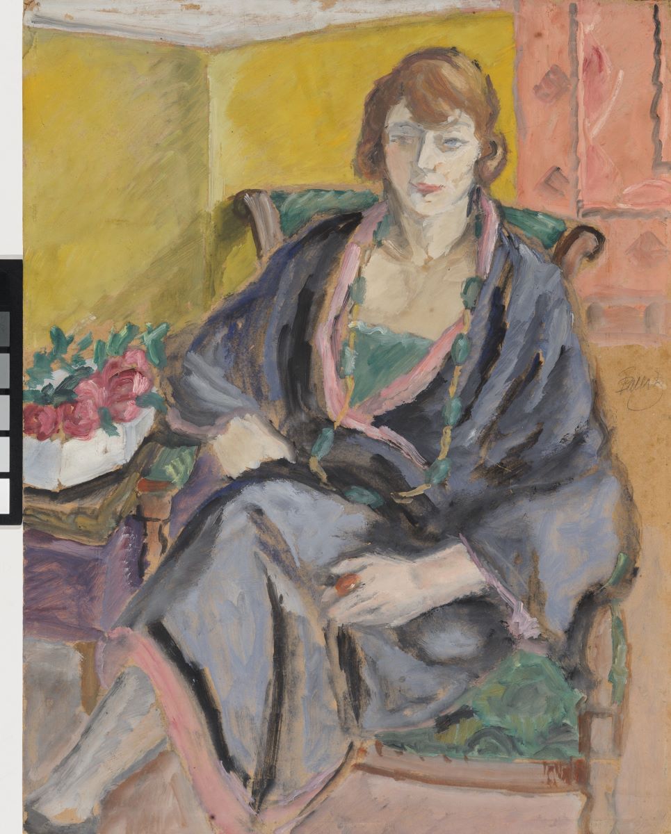 Descriere: Portret de femeie în interior, așezată pe un fotoliu. Este figurată din trei sferturi spre stânga. Are o poză nonșalantă, picior peste picior, privește undeva înafara tabloului. Poartă părul scurt, mărgele și un halat de prețios peste rochie. În stânga pe o mobilă joasă un vas cu flori; în spate în dreapta, pe perete un covor cu motive geometrice. Pictură reprezentativă pentru perioada revenirii în România, prin desenul puternic stilizat, aspectul cretos și fluid al pensulației, combinațiile decorative și gama cromatică prevalent rece.