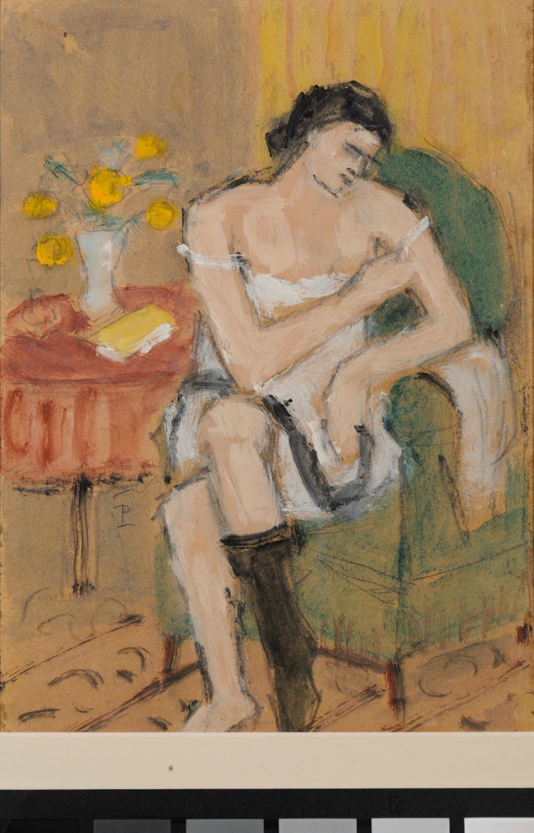 Descriere: Compoziție cu femeie în interior, așezată pe fotoliu. Este privită frontal, picior peste picior, cu capul plecat spre dreapta. Poartă o cămașă lejeră care îi dezgolește pieptul și umerii și un ciorap negru. În plan secund un gheridon, cu un vas cu flori și o carte. Pictură structurată de un desen cu duct discontinuu, cu accente intermitente, cu degradeuri transparente, într-o gamă cromatică armonică, de culori calde și reci. Măsuța și fotoliul apar în lucrări datate după 1940, ceea ce a facilitat datarea.