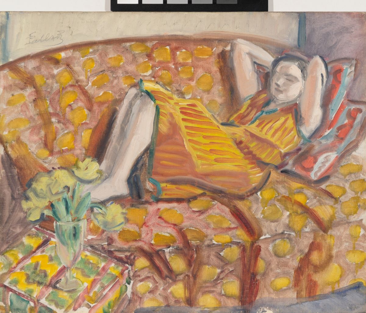 Descriere: Compoziție cu femeie în interior, culcată pe canapea. Este întinsă de la dreapta spre stânga, picior peste picior, cu brațele întinse pe sub cap. În prim-plan în stânga jos o măsuță cu blatul rebătut și o natură statică cu un vas cu flori. Interesul artistului se focalizează pe contrastele jocurilor decorative ale diverselor obiecte și carnația modelului, obținută din modularea culorii. Pictură cu tușe aparente, fragmentate, vibrate, ce evocă reminiscențe Nabis, într-o gamă cromatică prevalent caldă.