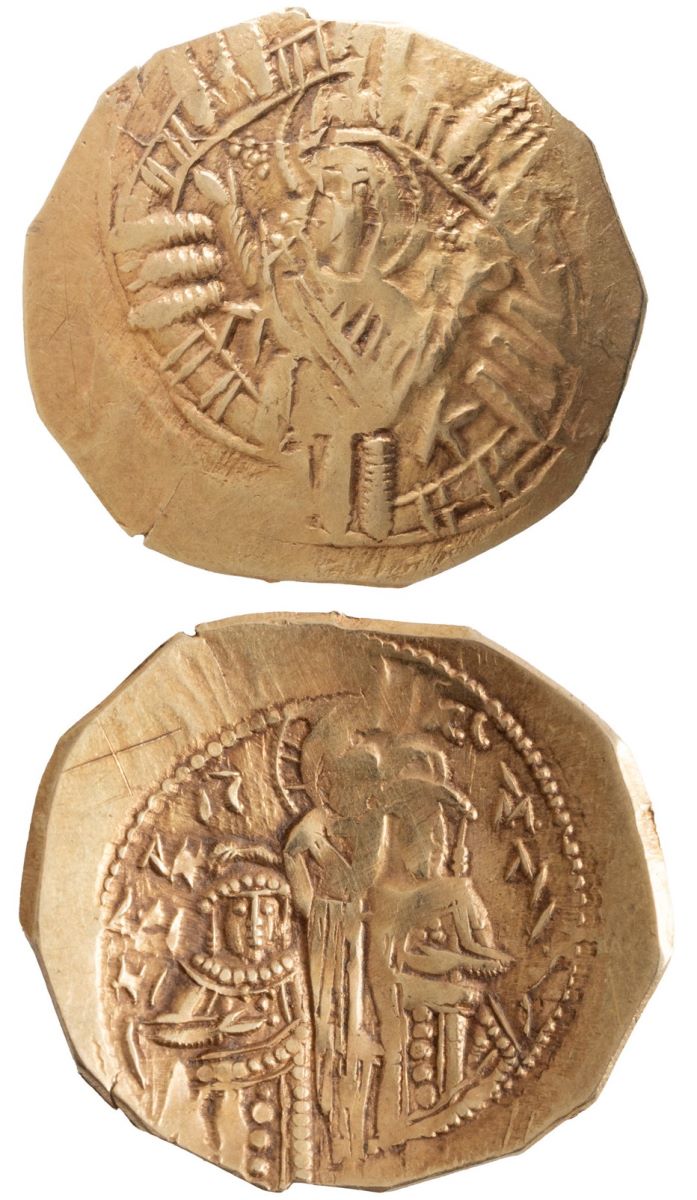 Descriere revers: Andronic, în stânga, și Mihail, în dreapta, îngenunchează de-o parte și de alta a lui Hristos, care stă în față și îi încoronează pe ambii împărați