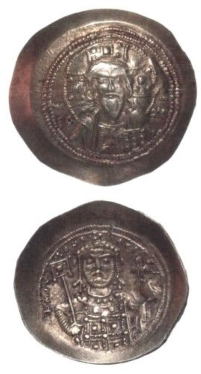Descriere revers: Bust frontal Mihail VII cu barbă; poartă stemma, este îmbrăcat cu clapotos loros și maniakion; în mâna dreaptă ține un labarum, iar în mâna stângă ține un glob cruciger.
