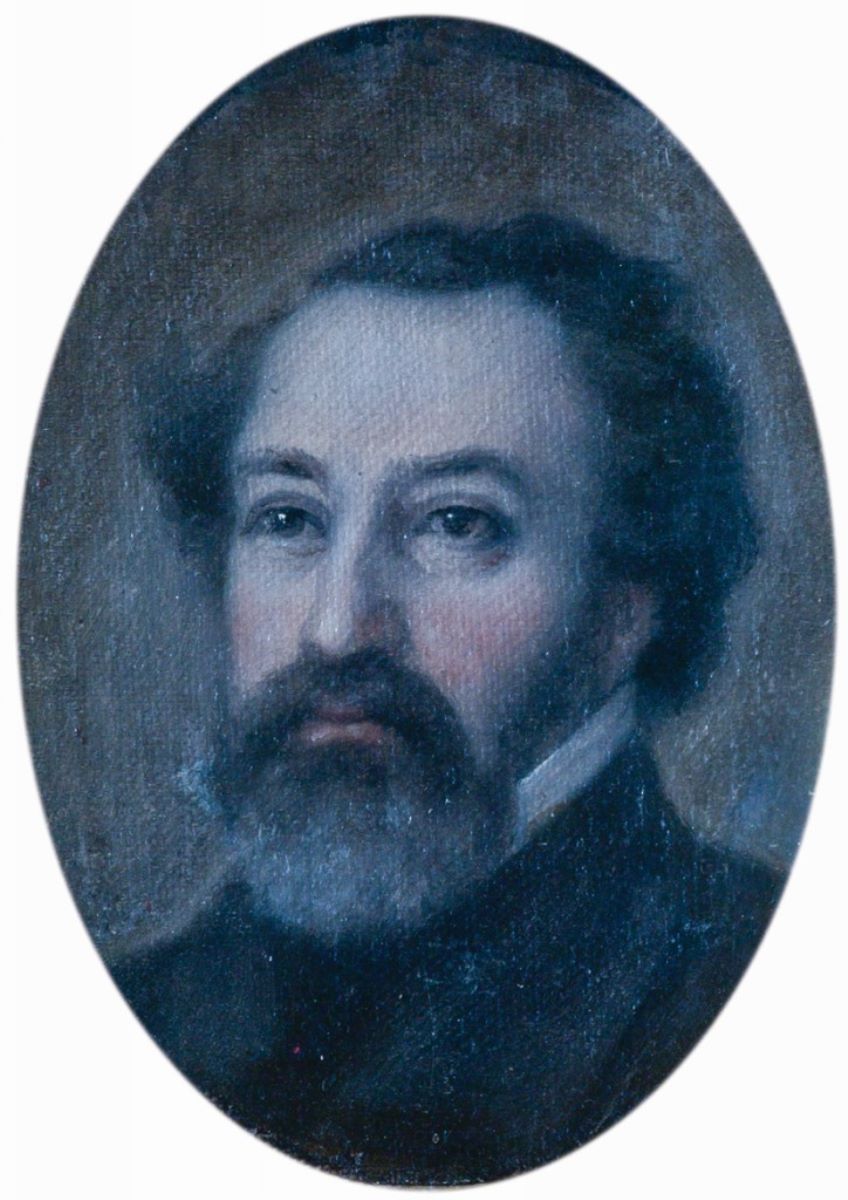 Descriere: Portret de bărbat în medalion, posibil Costache Negri (1812-1876), revoluționar și diplomat în timpul domniei lui Alexandru Ioan Cuza. Este privit din trei sferturi spre stânga, cap și parțial bust. Poartă părul pieptănat cu cărare pe o parte, mustață, barbișon, cămașă cu guler înalt și redingotă închisă la gat. Pictură de factură lisă, cu degradeuri de culoare, în armonii preponderent reci. Lucrare convențională, realizată după o fotografie, în manieră realist-academică.