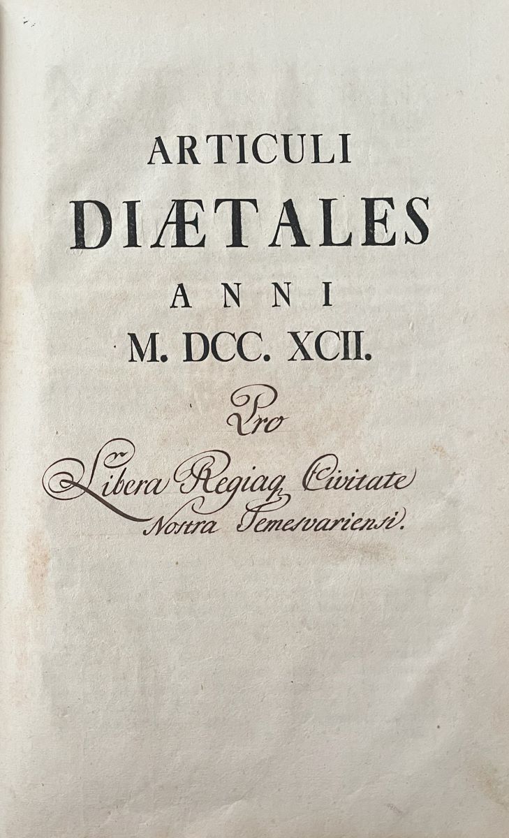 Descriere: Articuli Diaetales anni M. DCC. XCII. „Pro Libera Regiaque Civitate Nostra Temesvariensi” (adăugire manuscrisă)