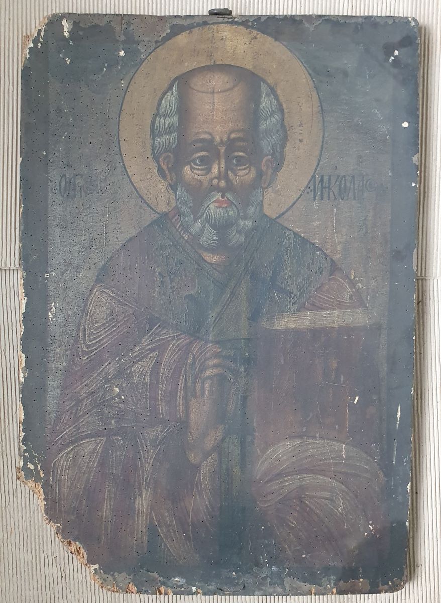 Descriere: Imaginea redă, cu tehnica barocului, aspecte specifice artei postbizantine vernaculare. Trăsăturile feței surprind vârsta înaintată prin calviția accentuată, mușchii de deasupra sprâncenelor și pomeții reliefați și pleoapele obosite, iar părul și barba surprind prin atenția la detaliu. Sfântul este redat bust, ținând Evanghelia închisă în mâna stângă și binecuvântând cu dreapta. Colțul inferior stâng lipsește, iar panoul este foarte fragilizat de acțiunea insectelor xilofage.