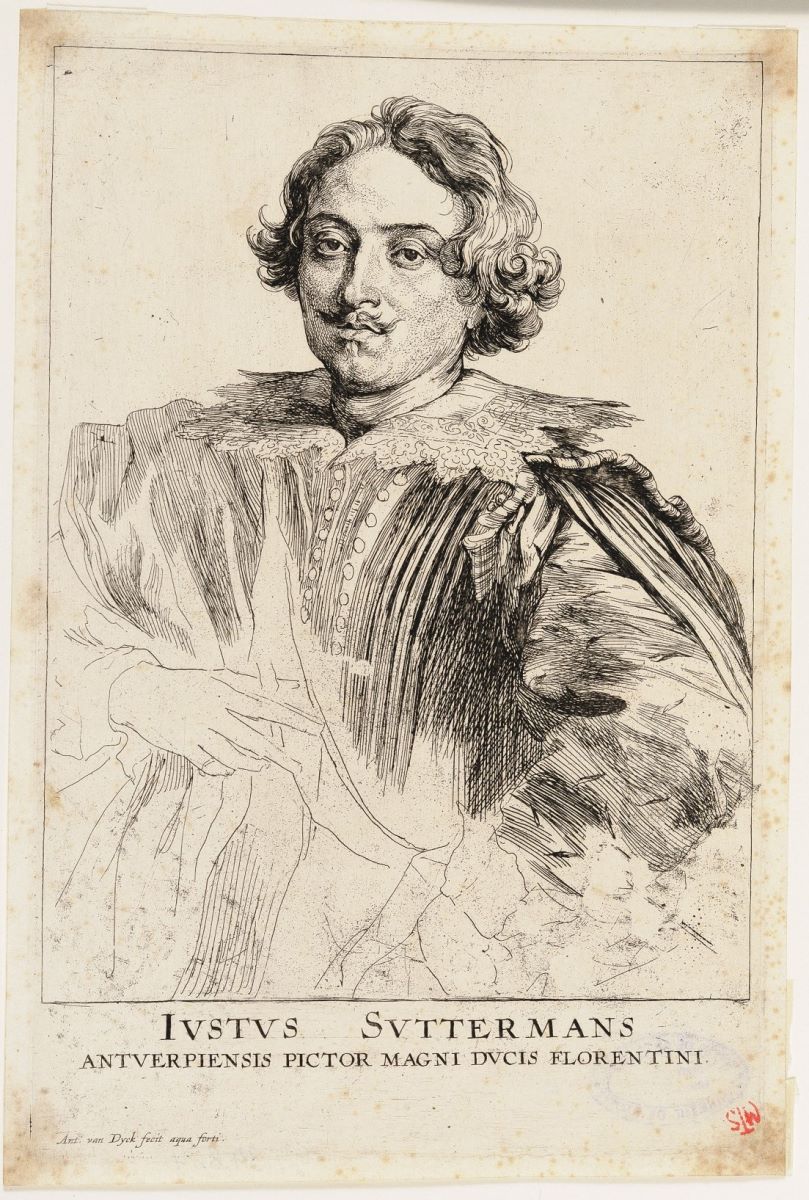 Descriere: Portret de bărbat tânăr, privit din trei sferturi, orientat spre stânga, privind spre spectator. Are părul buclat, tăiat scurt pe lângă urechi și mustăcioară. Poartă tunică încheiată cu două rânduri de nasturi și guler amplu, plat, cu colțișori. Pe umărul stâng o eșarfă pe care o ține cu mâna. Mâna dreaptă în șold, într-o atitudine mai degrabă blazată. Se pare că artistul lăsa neterminată o parte a planșei, ca în acest caz, spre a fi finisată de alți maeștri gravori. Portret care atestă excepționala virtuozitate a acvafortistului, linia fluidă, spontană, cu care plimbă acul pe verni, luminozitatea alertă pusă în contrast de hașuri catifelate. Intervențiile târzii în dăltiță (modeleului al figurii) indică intruziuni forțate într-un proces de revitalizare a plăcii, în vederea unor noi tiraje, după ce acestea au intrat după 1645 în posesia editorului Gillis Hendricx (activ între 1640-1677). Placa de aramă se păstrează la Calcografia Luvrului, inv. 2313. Inscripții gravate mijloc jos, sub cadru în limba latină: IVSTVS SVTTERMANS / ANTVERPIENSIS PICTOR MAGNI DVCIS FLORENTINI (Justus Suttermans din Antwerpen, pictor al marelui duce al Florenței). Semnat gravat stânga jos în limba latină: Ant. Van Dyck fecit aqua forti. Ștampila MTS dreapta jos.