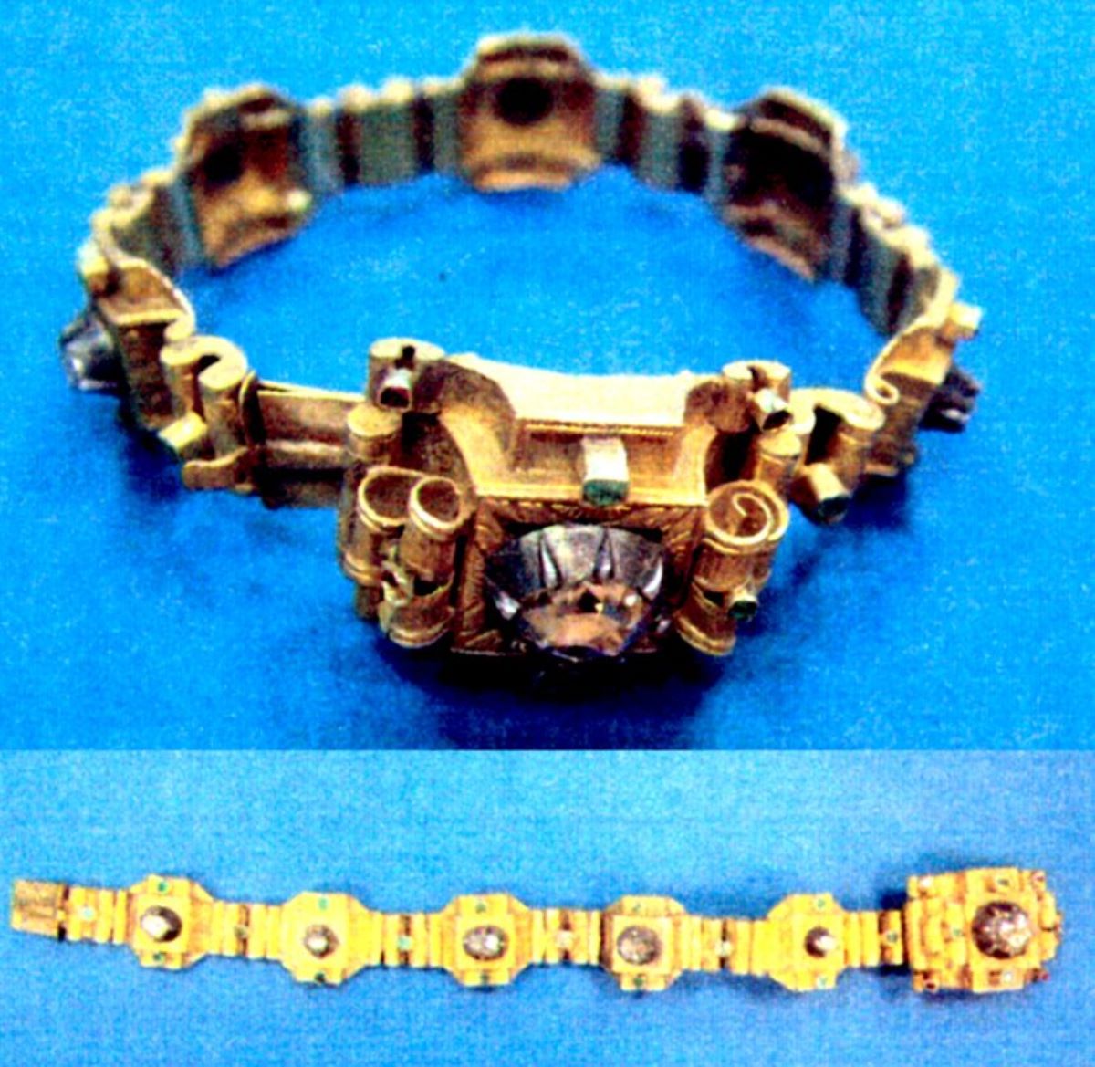 Descriere: Brățară realizată din foaie de aur, din cinci ghilduri mai mici și unul mare (închizătoarea) fixate între ele cu ajutorul unor balamale mobile. Ghildul închizătoare decorat cu un diamant central mare, șlefuit în formă de roză și fixat cu ajutorul a opt ghiare de argint, celelalte ghilduri fiind ornamentate în aceeași manieră cu diamante mici, fixate cu câte patru ghiare din argint. Diamantele sunt flancate de câte două smaralde, fixate în casete ovale. La exterior, în zona balamalelor, câte un smarald fixat în casetă ovală. Ghildul închizătoare are în colțuri, câte un rubin. Ghildurile brățarii au fost ornamentate suplimentar cu un ornament geometric, realizat prin incizare și gravare. Pe reversul piesei, patru din cele șase casete cu diamante au fixate cu patru știfturi din metal comun.