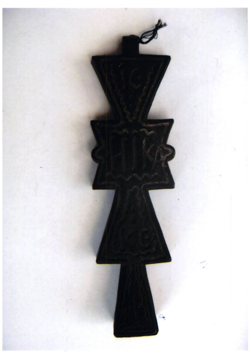 Descriere: Obiect de cult în formă de cruce, decor geometrizat, linie dreaptă, având pe o față incizate inițialele: ICXC NIKA, iar pe verso, ușor incizat: 1898. În partea inferioară pristolnicul este în formă de piramidă și inscripționat pe bază, cu același text. Perforat pe partea superioară pentru susținere.