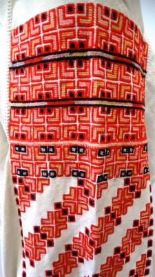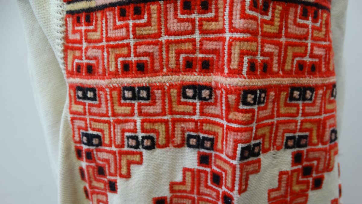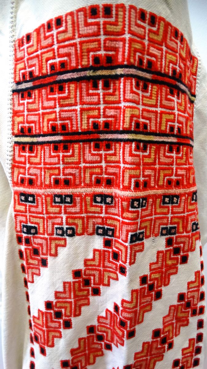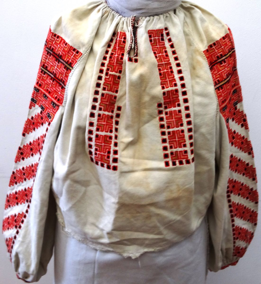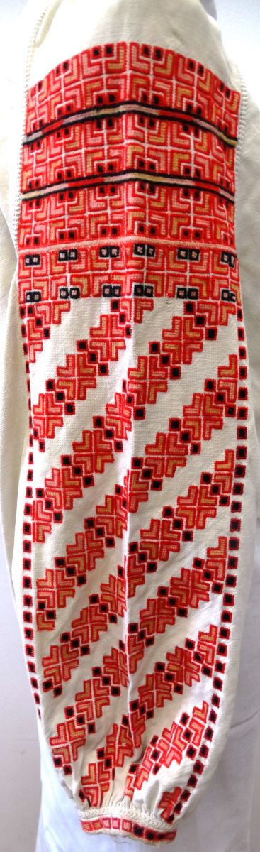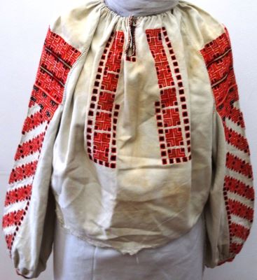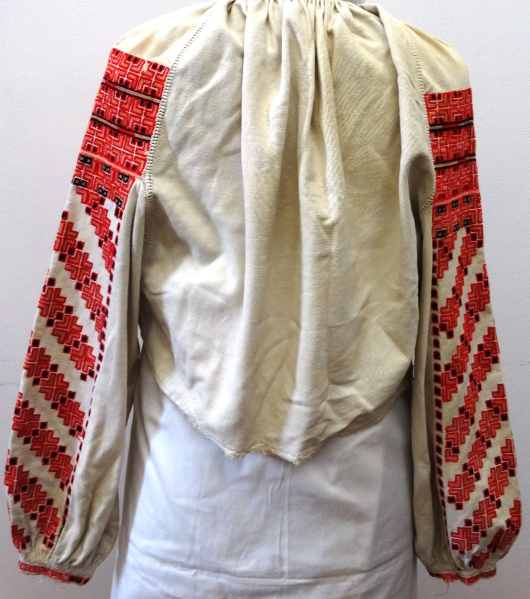 Descriere: Cămașă încrețită din pânză sacâz (de bumbac gros) lată de 55 cm, cu stan din 2 foi (lați), cu altiță separată, brezărău și mânecă cu bentiță; racordarea stanilor la mânecă este marcată de rânduri de găurele duble; stanul față este decorat cu două rânduri de talbe cu motiv cruce dreaptă în miez de nucă realizate cu strămătură roșie, roz, neagră și oliv, bordate de șiruri de pătrate mici realizate din strămătură neagră în chenar roșu; stanul spate este fără decor; decorul geometric al mânecii este în table dispuse oblic (costișat), fiind reprezentat de rânduri de cruci în miez de nucă separate de grupe de câte 3 romburi mici dispuse vertical; tablele de pe mânecă sunt încadrate de două șiruri verticale de pătrate mici realizate din strămătură neagră în chenar roșu; altița separată repetă decorul de pe mânecă dar îl dispune orizontal, în 3 rânduri (table) separate de linii de broderie fină în alternanță cromatică; încrețul are același decor ca și altița dar inversează culorile pătratelor mici, chenarul fiind negru iar interiorul roz; decorul acoperă aproape toată jumătatea de deasupra a mânecii; bentița mânecii este îngustă și este brodată cu strămătură, decorul fiind format din pătrate alternând cromatic în grupe de câte trei.
