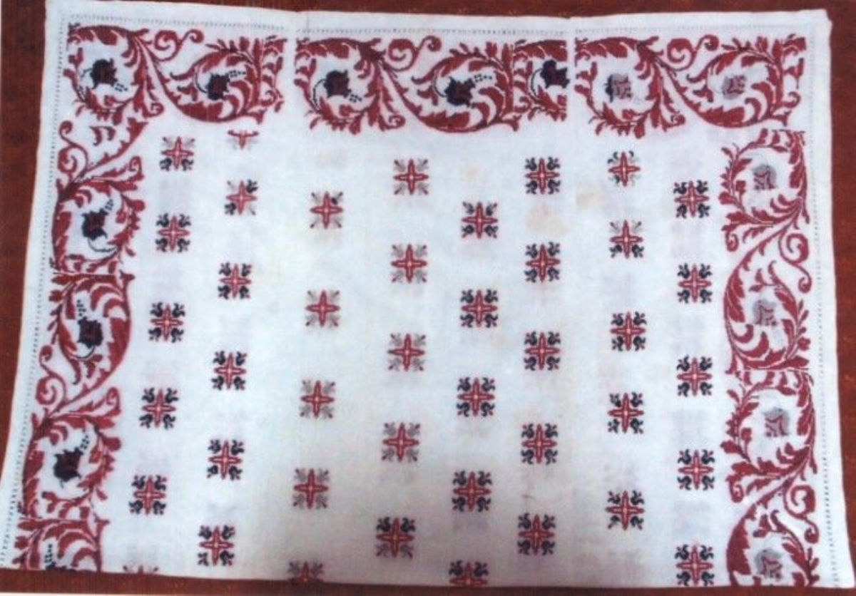 Descriere: Formă dreptunghiulară, alcătuită din trei foi încheiate cu acul, decor amplasat pe toată suprafața, dispus sub formă de chenar pe toate cele patru laturi plasat lângă tivul cu găurele și șabac, reprezentând motive florale stilizate: lalea, frunză. Câmpul este ornamentat cu motive geometrice și florale întrerupte: cruce dreaptă, lalea. Cromatică: alb, roșu, negru.