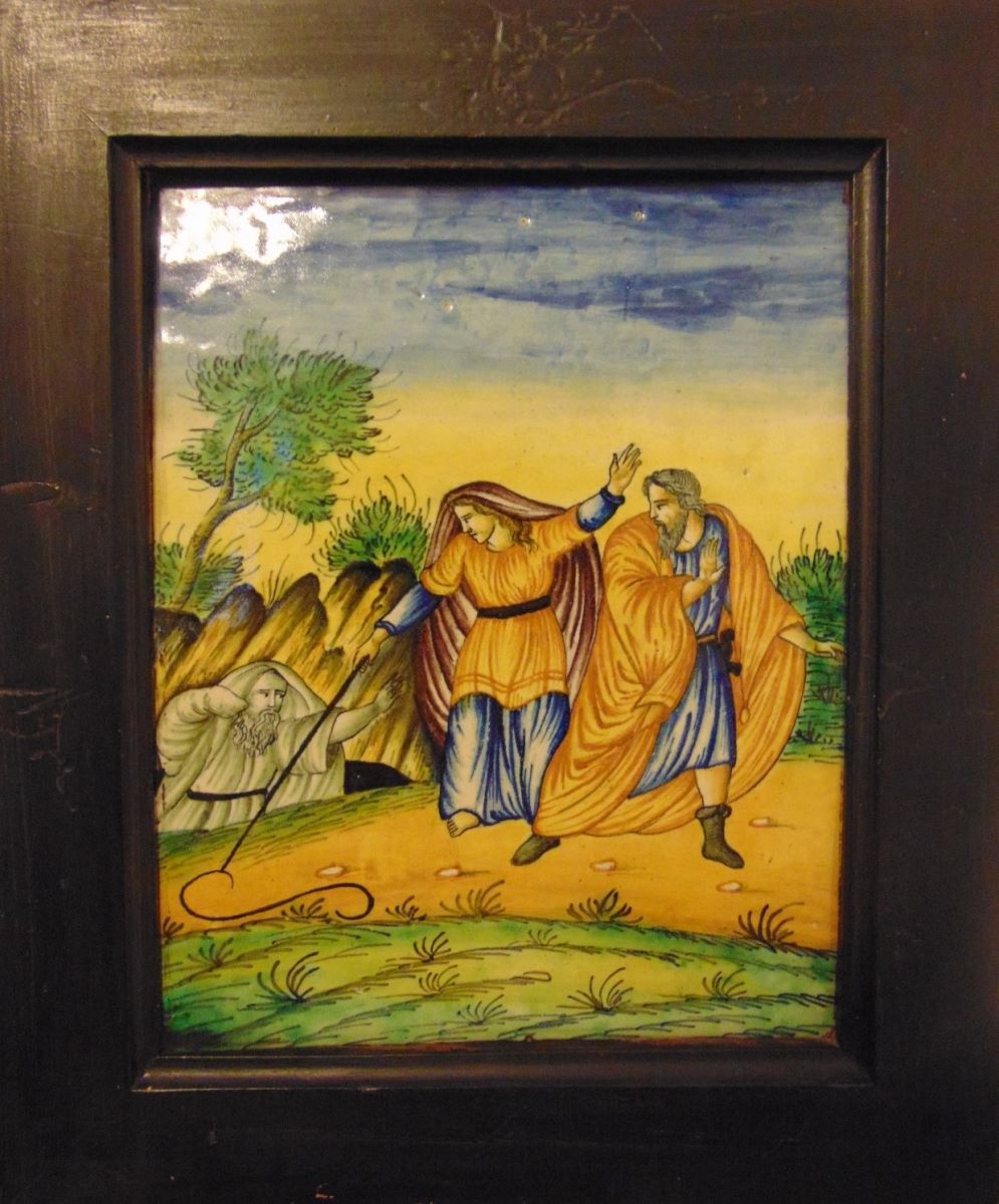 Descriere: Placă decorativă din faianță, compoziție pe verticală, cu scena biblică „Moise transformând toiagul în șarpe”. Moise ales de Dumnezeu să scoată poporul evreu din robia egipteană, aruncă în fața faraonului toiagul său, care se transformă în șarpe, cu ajutorul lui Dumnezeu. Piesă gen Savona, cromatică verde, galben și albastru. Placa cu ramă din lemn băițuit cu negru. Eticheta originală a manufacturii „ARTE INDUSTRIALE ALBERTO ISSEL GENOVA VIA ROMA 11”.