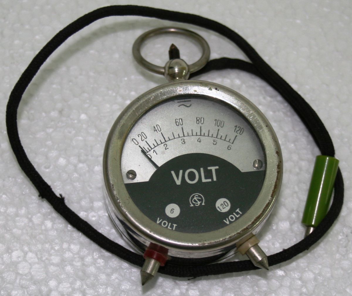 Descriere: Aparat de masură electromagnetic folosit în radiotehnică pentru determinarea valorilor tensiunii de filament și a tensiunii anodice a tuburilor electronice și a bateriilor anodice si de filament. Se măsoară numai în curent continuu. Aparatul este de mici dimensiuni, de formă circulară în carcasă metalică și cu cadran protejat cu sticlă. Este prevăzut cu trei borne de ieșire: 6V, 120V și testerul cu cablu pentru măsurare. Cadranul circular este prevăzut în jumătatea superioară de culoare albă cu o scară cu gradații pe două registre de la 0 la 120V pentru masurarea tensiunii anodice și cu gradații de la 0 la 6V pentru tensiunea de filament și ac indicator. Jumătatea inferioară a cadranului, de culoare neagră, are inscripționate cele două tensiuni 6V și 120V în dreptul bornelor corespunzătoare și sigla firmei Schoeller & Co.