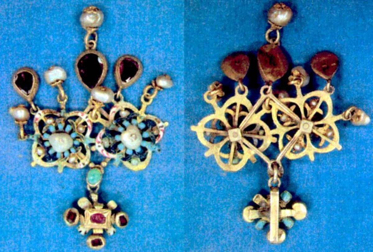Descriere: Pandantiv de aur, constituit din trei segmente, mobile și fixate între ele cu anouri. Segmentul 1: formă cruciformă, pe un suport crucifor au fost fixate în casete ovale 3 almandine, iar în centru, într-o casetă dreptunghiulară, un rubin(?). În zona de contact cu segmentul, pe avers, într-o casetă ovală un turcoaz. Segmentul 2: pe o ramă rombică, au fost prinse cu ajutorul unor nituri, două motive ajurate identice, ilustrând două flori, marginile petalelor fiind decorate cu email alb, roșu și albastru; între petale au fost fixate, opt perluțe și una mai mare în centru, fixate cu nit de aur; în jurul perlelor centrale, se află un chenar de peruzele. Segmentul 3: este alcătuit de pandelocuri. De colțul inferior al ramei rombice atârnă un pandeloc cu almandin, fixat într-o casetă cordiformă, prevăzut în plus cu pandeloc cu perlă. De cele două rame florale ajurate, atârnă câte două almandine.