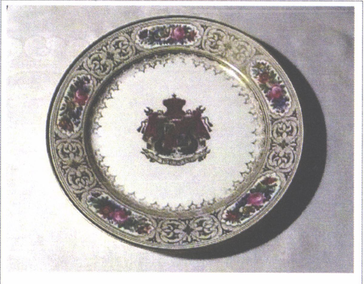 Descriere: Farfuria face parte dintr-un serviciu de masă compus din peste 100 de piese comandate la manufacturile regale din Sèvres de către familia domnitoare Cuza. Serviciul urma să fie folosit în palatul domnesc din Cotroceni. Farfuria este întinsă, circulară și pictată pe margini cu cinci medalioane florale care alternează cu arabescuri aurii. Reprezintă modelul decorativ în stil Louis-Philippe, creat în anul 1844 de către ceramistul Charles Antoine Didier, fiul. Farfuria este decorată central cu stema Principatelor Unite și deviza unionistă „Toți pentru Unu”. Stema și motivele florale se caracterizează printr-o vie policromie: galben, nuanțe de roșu, roz, verde și albastru. Pe reversul ei apar două mărci în câmp circular, „Chateaux de Trianon” (culoare roșu-carmin) și „Sevres 1846” (cu albastru). De asemenea se remarcă cartelul care conține, în cifre latine, datele dublei alegeri ale lui Alexandru Ioan Cuza ca principe al Țării Românești.