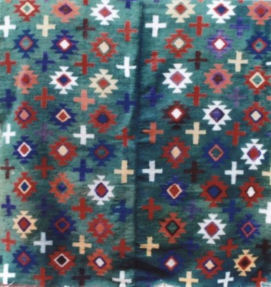 Descriere: De formă dreptunghiulară, din două foi încheiate cu acul, decor geometric amplasat pe toată suprafața bazat pe principiul alternanței decorative și cromatice: motivul cruce dreaptă în alternanță cu romburi concentrice de diferite culori pe un fond verde. Cromatică: verde, roșu, alb, galben, portocaliu, albastru, liliachiu, maro.
