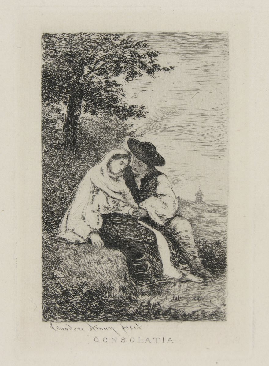 Descriere: Scenă de gen idilică, cu un cuplu de tineri în costume populare, șezând, într-un cadru natural. Semnat stânga jos, în afara cadrului: „Theodor Aman fecit”. Intitulat jos mijloc, în afara cadrului: „CONSOLAȚIA”.