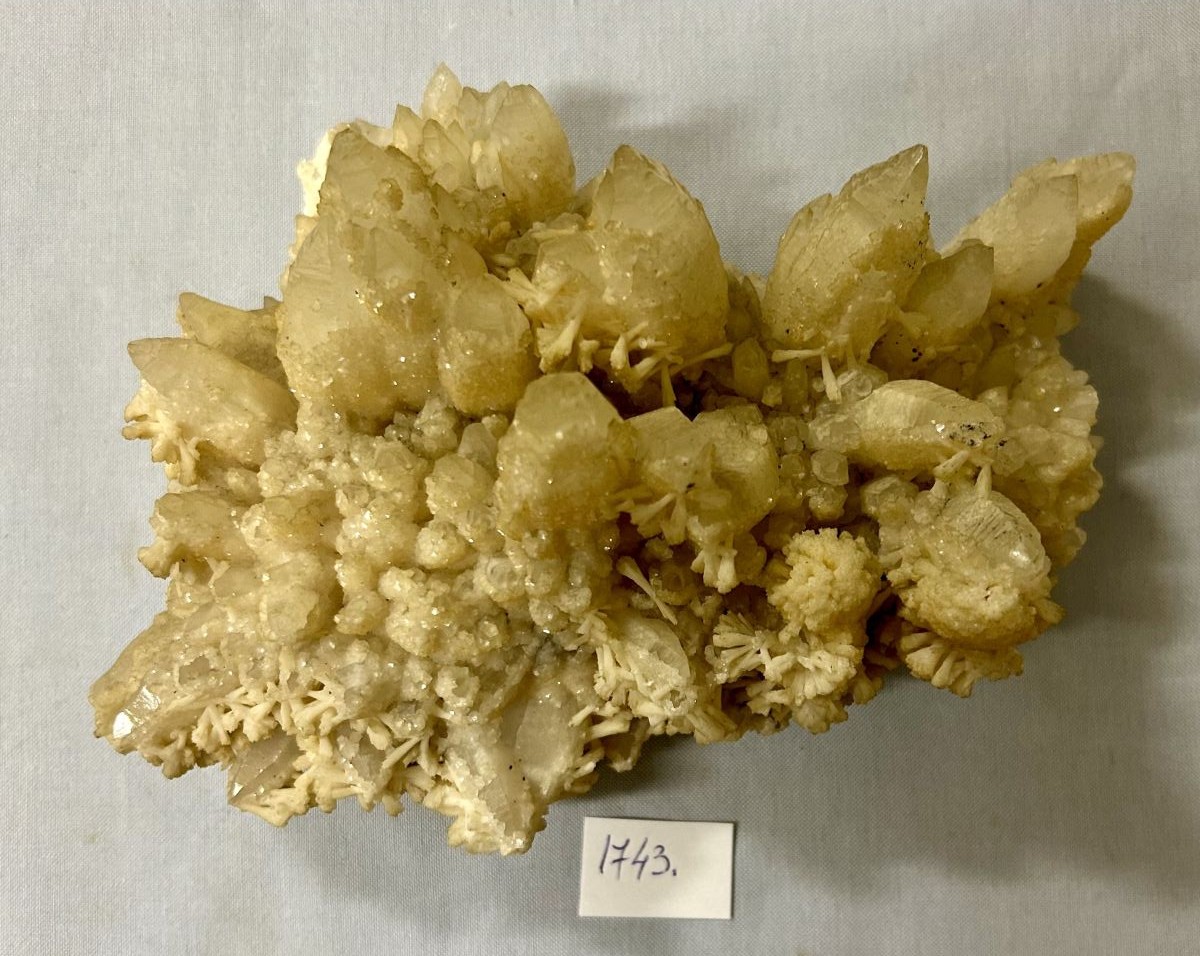 Descriere: Eșantion mineral reprezentând cristale prismatice de cuarț, în concreștere radiară, cu vârfuri intacte, dimensiuni de 6-7 cm, semitransparente, în combinație cu smocuri de sscalenoedri de aragonit, alb-lăptos, mat. Proporții bune ale celor două specii minerale și aspect general unitar.