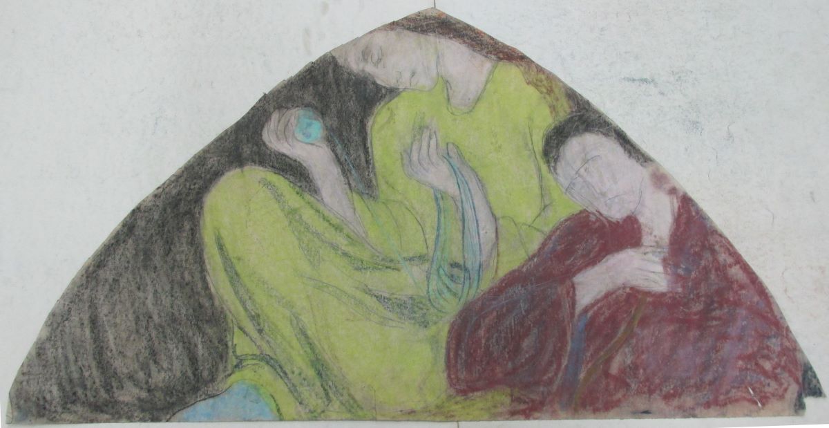Descriere: Schiță pentru tavanul holului de intrare în casa Storck. Compoziție alegorică înscrisă într-un triunghi sferic, cu o pereche șezând, probabil soții Storck. Ambii sunt orientați spre stânga, femeia deapănă un scul de lână, bărbatul, meditează cu capul plecat și mâna stângă la piept. Atmosferă apăsătoare, de griji și probabil anticipând Primul Război Mondial. Desen cu duct fluid, cu detalii restrânse pentru a lăsa loc petelor de culoare, aplicate în ton local cu degradeuri. Cromatică surdă, în tonalități cu alternanțe de culori calde și reci, negru, brun, roșu și diverse tonalități de verde. Ursul Koala de pe verso confirmă vizitele cu copii la Grădina Botanică (vezi Eleonora Costescu, p. 61, nota 252).