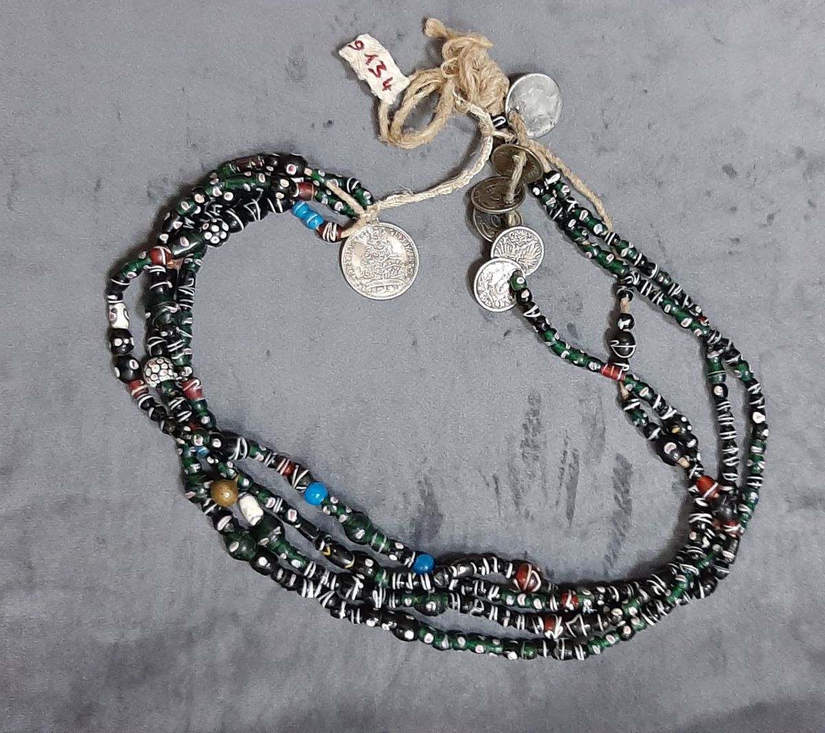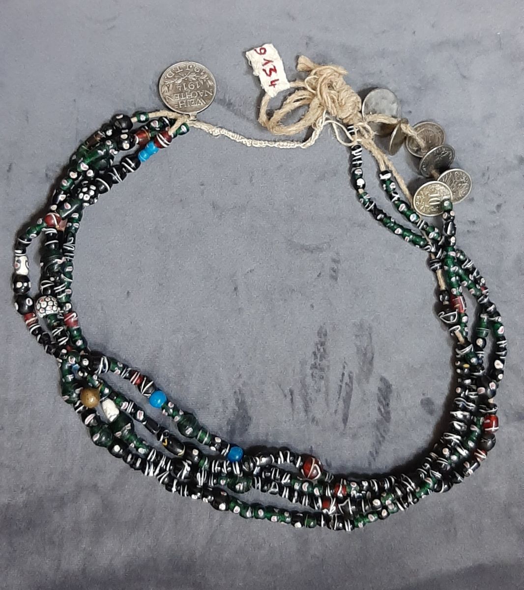 Descriere: Piesa este formată din 4 șiruri de mărgele mozaicate de dimensiuni diferite, înșirate pe ață, alternând mărgele mici cu mărgele mai mari. La un capăt este prinsă o medalie din Primul Război Mondial din Campania din Rusia - Crăciun anului 1914, iar la celălalt capăt sunt prinse monede: Austria, Franz Joseph I (1848-1916): 5 monede de 10 helleri bătute în: 1893 (Ni), 1895 (Ni), 1910 (Ni), 1915 (CuZn) - 2 buc, 1895,1910, 1893, 1915 și 1/4 gulden (Ag 0,520, 5,345 gr.) - an ilizibil (¼ gulden s-a bătutu între 1857 și 1875). Printre mărgele este prins și un nasture mic de alamă. Cromatică: negru, argintiu, alb, verde, albastru, roșu, roz.