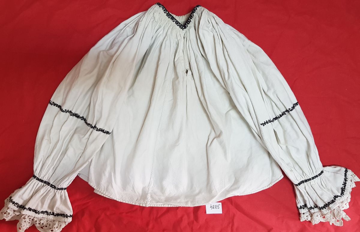 Descriere: Cămașă femeiască fără poale, confecționată din pânză de casă, țesută în două ițe. Gura în față, încheiată în jurul gâtului; se încheie cu un nasture. Mâneca largă pornește de la gât, cu platcă la subsoară. Deasupra fodorului mâneca este prinsă în creț, brodat cu motive geometrice; mâneca se termină cu fodor (volan) încrețit, mărginit cu dantelă croșetată. Decorul realizat din motive florale și geometrice se reduce la motivele dispuse pe guler, la alesăturile de la cot și de pe fodor, completat discret cu mărgele maronii. Cromatica: alb, negru.