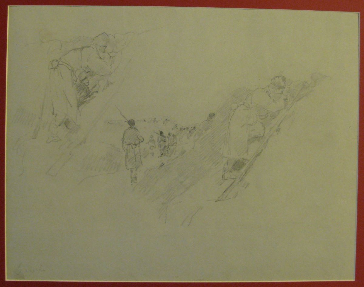 Descriere: Grigorescu a participat la solicitarea lui Carol Davila, la campania din 1877, urmărind și înregistrând ca într-un film, in situ, desfășurarea războiului. Într-un furgon comandat special, el urma convoaiele armatei având ocazia să sesizeze toate aspectele luptelor, cu învinși și învingători. Este cazul desenului în discuție, o vedere a tranșeelor de la Grivița spre care avansează soldații români și două schițe cu dorobanți în tranșee țintind cu flintele spre armata turcă. Desen executat rapid, în vârful creionului, cu hașuri scurte și efecte picturale.
