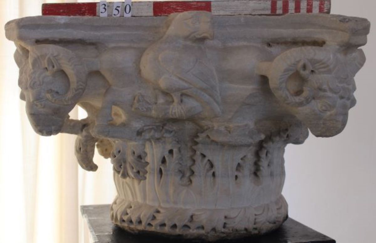 Descriere: Capitel de epocă romano-bizantină în stil compozit, rupt la un colț, din marmură alb-vineție, format din două zone distincte : la partea superioară este decorat la colțuri cu capete de berbeci, la mijloc cu acvile cu prada în gheare, iar la partea inefrioară frunze de acant.