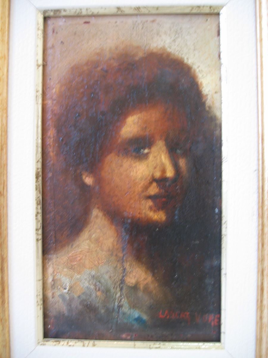 Descriere: Portret de femeie tânără cu capul în semiprofil-dreapta. Personajul are trăsături regulate, ochii albaștri, pielea arămie și părul bogat, ondulat. Lumina puternică modelează figura. Cromatica este caldă, cu nuanțe de ocru, galben și brun.