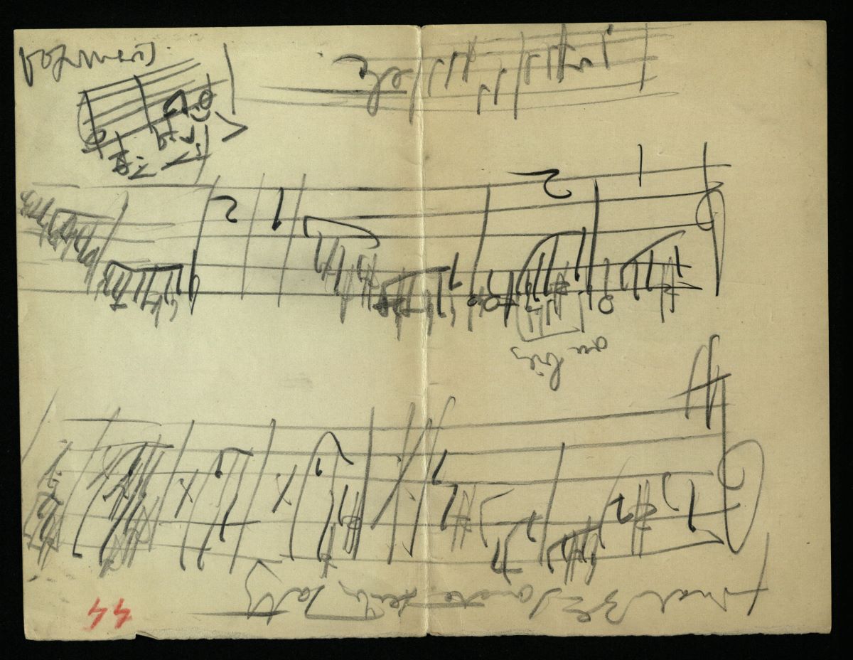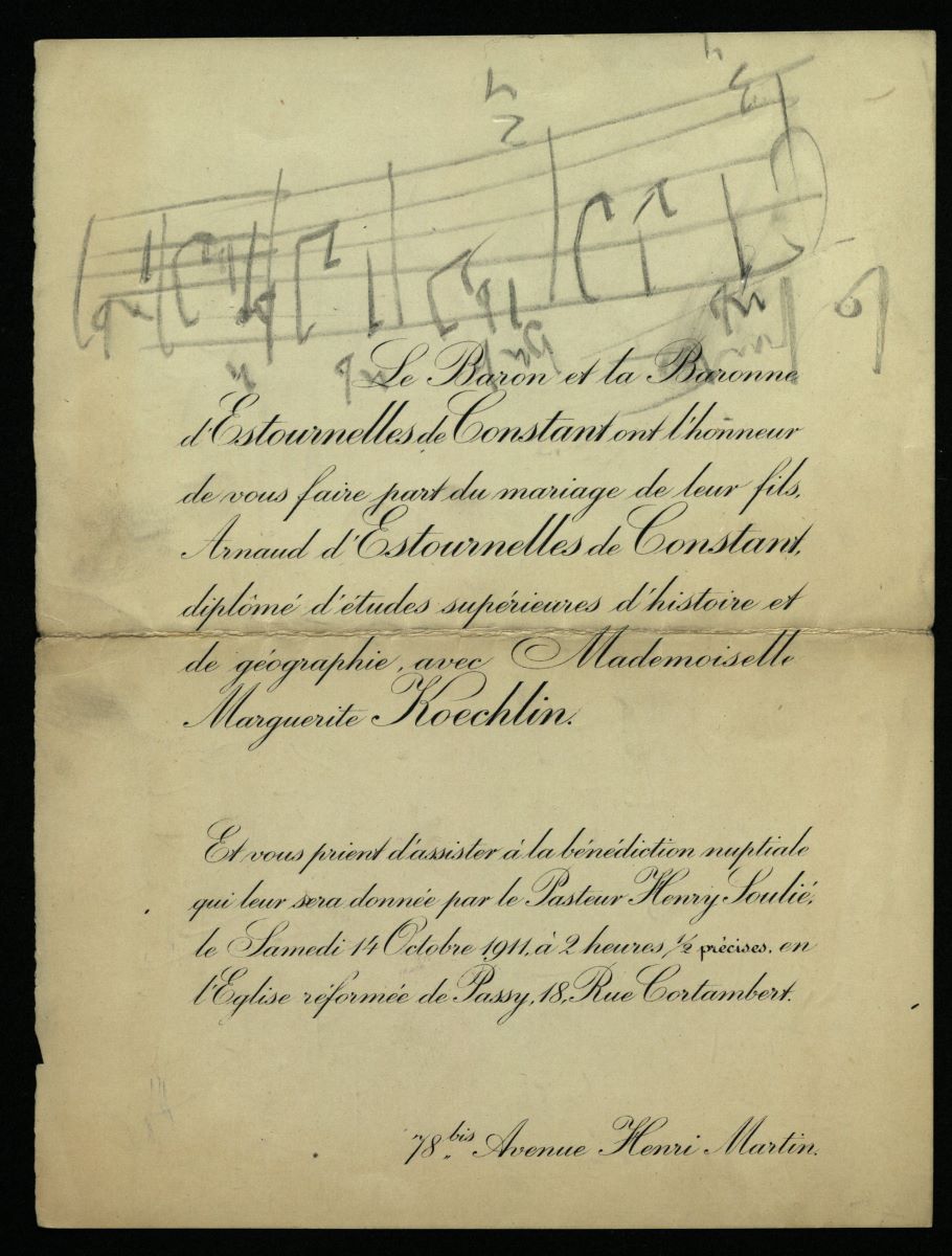 Descriere: Invitație de nuntă pe hârtie, dactilografiată, o filă (2 pagini). Conține fragmente muzicale notate de compozitor pe ambele părți ale documentului. Pe fața acestuia, deasupra textului dactilografiat, e scris un fragment de 5 măsuri (neidentificat), pe un portativ trasat manual, cu creionul, în 3 și 2 pătrimi. Pe verso, sunt schițe aferente altor creații, cel mai probabil finalului din Sonata a 3-a (pentru pian și vioară ”în caracter popular românesc”, op. 25?) - 16 măsuri, respectiv Vox Maris - 2 măsuri, titlu notat chiar de compozitor. Toate fragmentele muzicale sunt scrise pe portative trasate manual, completate cu creionul. Invitația la nuntă (dactilografiată, cerneală neagră, scris cursiv) este datată 14 octombrie 1911.