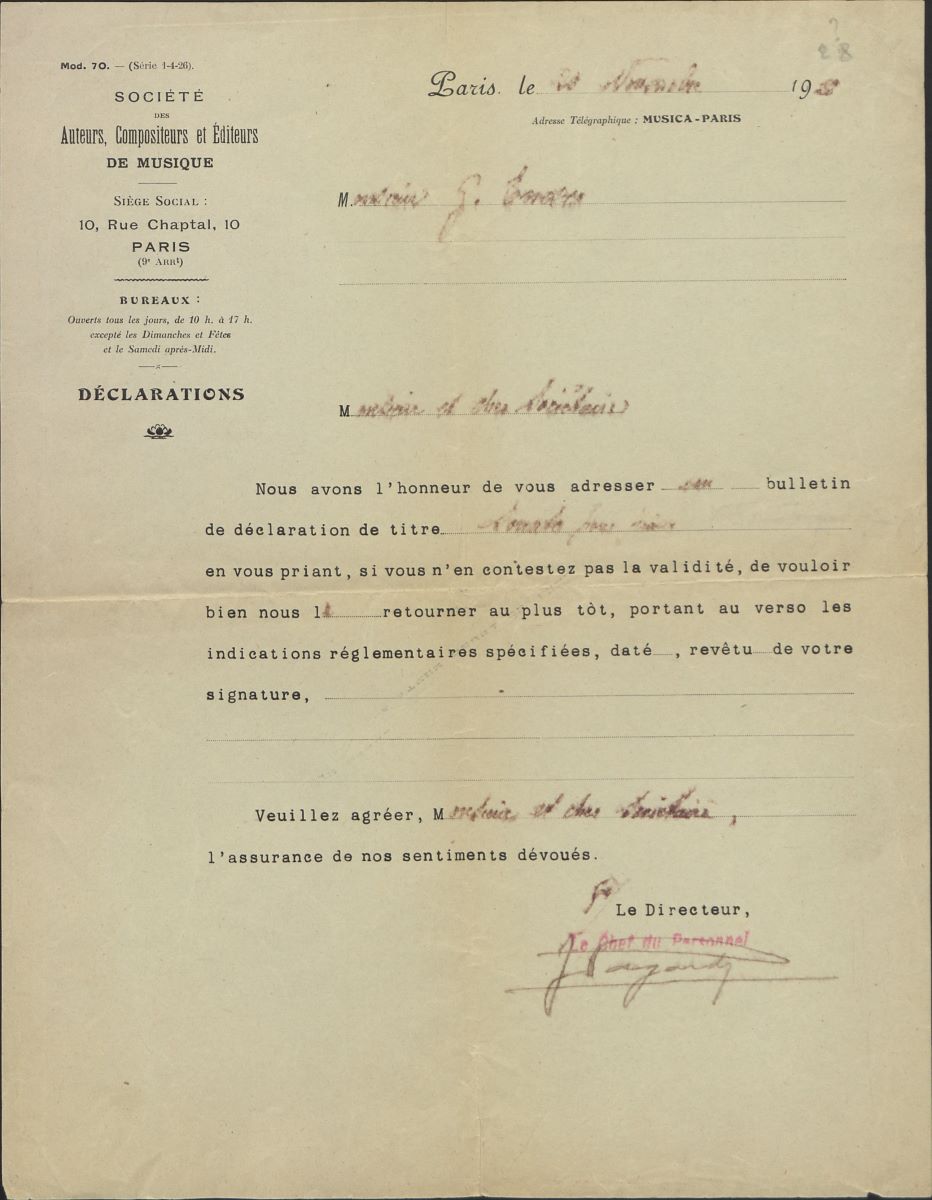 Descriere: Scrisoare adresată compozitorului George Enescu prin care SACEM (Société des Auteurs, Compositeurs et Éditeurs de Musique) îl invită pe muzician să completeze declarația pentru „Sonată pentru pian”. Probabil, este vorba de „Sonata nr. 1 în fa diez minor”, op. 24, compusă în 1924 și dedicată pianistului elvețian Emil Frey (8 aprilie 1889 – 20 mai 1946). Semnătură olografă indescifrabilă.