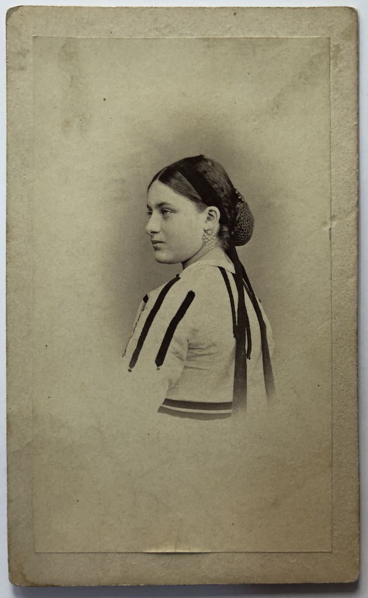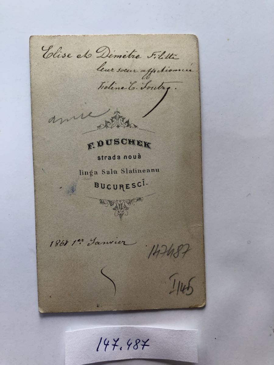 Descriere: Fotografie sepia reprezentând o tânără (Elena C. Suțu) din spate, cu chipul din profil stânga și părul strâns într-un coc cu plasă. Hârtia fotografică este lipită pe un carton care are pe verso marca atelierului (numele și adresa fotografului între două viniete): „F. DUSCHEK/ strada nouă/ linga Sala Slatineanu/ BUCURESCI”. Tot pe verso, o dedicație olografă din partea Elenei Șuțu către sora ei Elisabeta (Eliza) Filitti, „Elise et Démétre Filitti/ leur soeur affectionée/ Hélén C. Soutzu” și data „1864 1-er Janvier”. Elena Suțu (1852-1925), fiica lui Constantin Șuțu și a Elenei Constantinidi-Odobescu a fost adoptată, alături de încă patru frați (Elisabeta, Maria, Zoe și Nicolae) de Ioan Suțu (1783-1870), fratele tatălui ei. Elisabeta/Eliza (1848-1921) a fost căsătorită cu Dumitru Filitti (1839-1896); la acest cuplu se referă dedicația de pe verso.