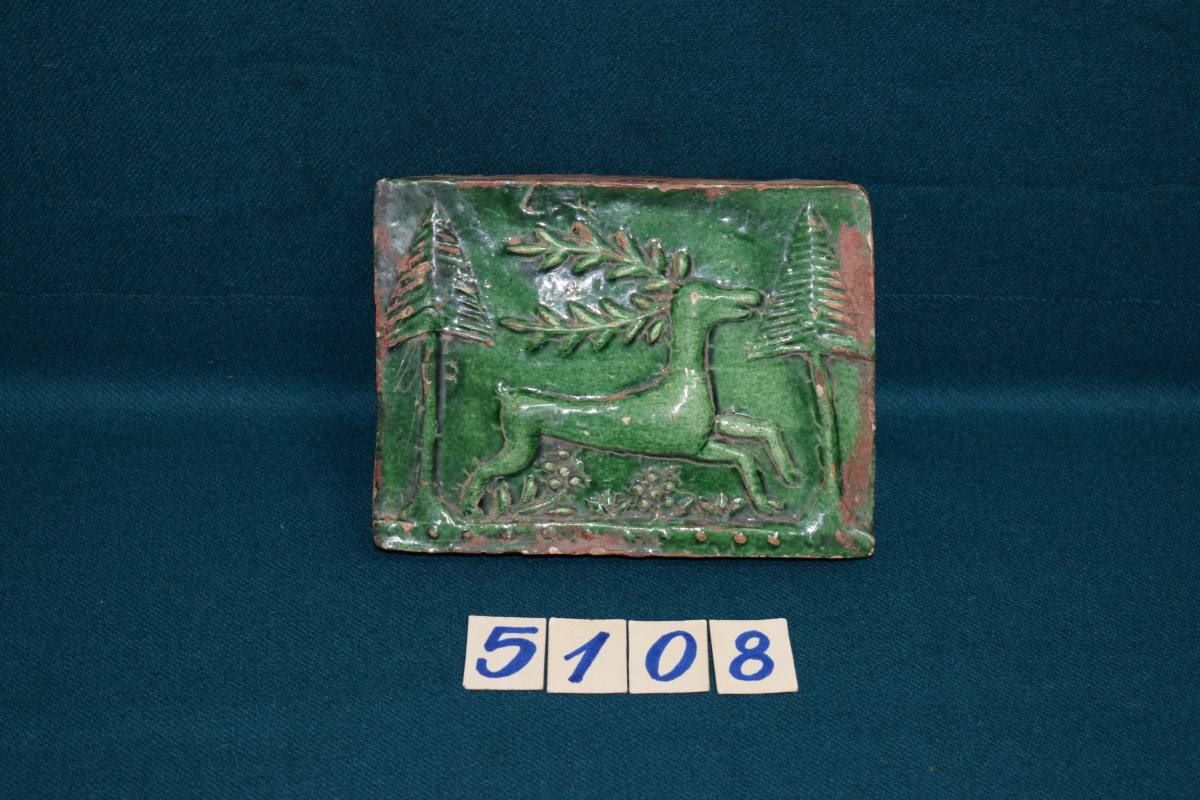 Descriere: Placa de sobă provenind dintr-un atelier săsesc bistrițean, activ în veacul al XVIII-lea, a fost creată cu ajutorul unui tipar săpat în lemn, reprezentând un cerb încadrat de brazi. Tema cerbului Sfântului Hubert, purtând o cruce între coarne, a fost frecvent folosită în decorația cahlelor săsești. În acest caz motivul își pierde conotațiile religioase, atenția meșterului mergând spre tratarea naturalistă a motivului și inserția sa într-un cadru peisagistic. Placa este acoperită cu un smalț de culoare verde. Cromatică: verde.
