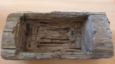 Material/Tehnică (text): trocul este confecționat din lemn prin cioplire