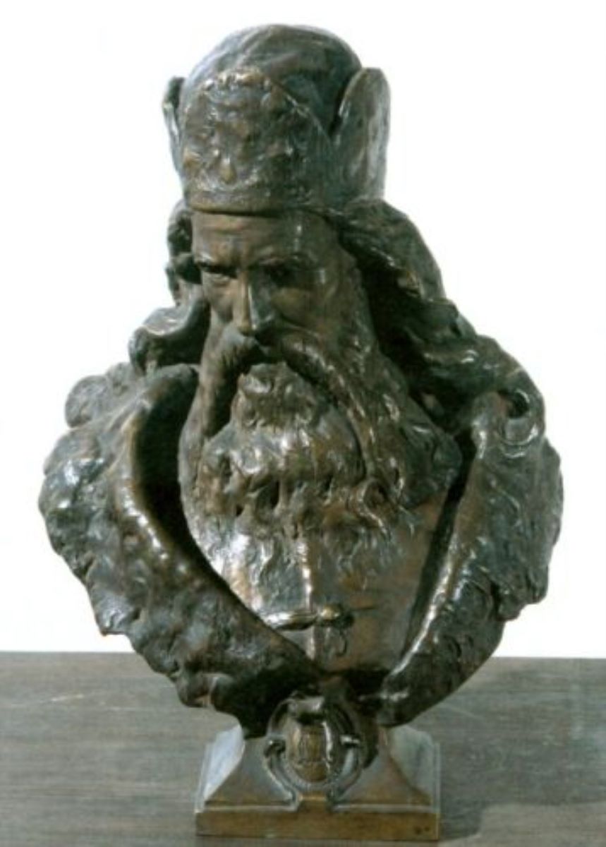 Descriere: Portretul lui Miron Costin cu barbă, mustață și plete. Pe cap o coroană. Semnat spre centru: V. Hegel. Însemnare față spre bază în monogramă: M.C.