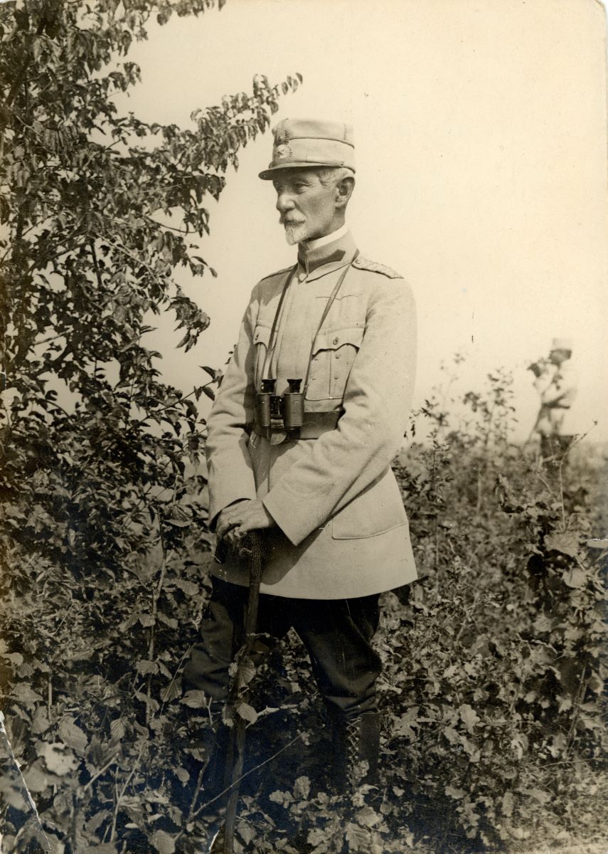 Descriere: Imaginea îl reprezintă pe generalul Alexandru Averescu, în calitate de comandant al Armatei a II-a române, la postul său de observație de pe frontul Mărăști, în iulie 1917. El poartă uniforma adecvată gradului, ținuta de campanie de vară, md. 1912, cu cisme, stă în picioare, iar la gât are atârnat un binoclu. Are mâinile coborâte și încrucișate deasupra unui baston; generalul este surprins din semi-profil, uitindu-se spre satul Mărăști, în depărtare, înconjurat fiind de o vegetație abundentă. În plan secund și în dreapta sa, se observă încă un ofițer, privind printr-un binoclu. Pe verso, sus și centrat este scris nr. de inv. „19878”, cu cerneală albastră, sub care, în dreapta, este aplicată ștampila ovală, cu specificarea: „Biblioteca MMN”. La 2,50 cm în jos față de nr. inv., este și o ștampilă rotundă cu aceeași legendă. Imediat sub nr. de inv., centrat, pe 5 rânduri, este scris de mână, în creion negru: „Generalul de corp (armată)/ Alexandru Averescu/ conducătorul Armatei 2/ pe frontul Siret-Trotuș/ a trecut cu cercetarea frontului”.