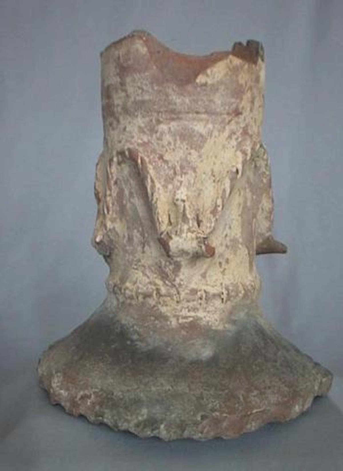 Descriere: Opaiț getic, din pastă roșie, poroasă, în formă de farfurie adâncă modelat peste un fragment de gât de amforă (de formă cilindrică) elenistică de import. Suprafața cu crustă de calcar. Buza decorată cu alveole și suportul cilindric ornamentat cu crestături și ghirlande cu bucranii.