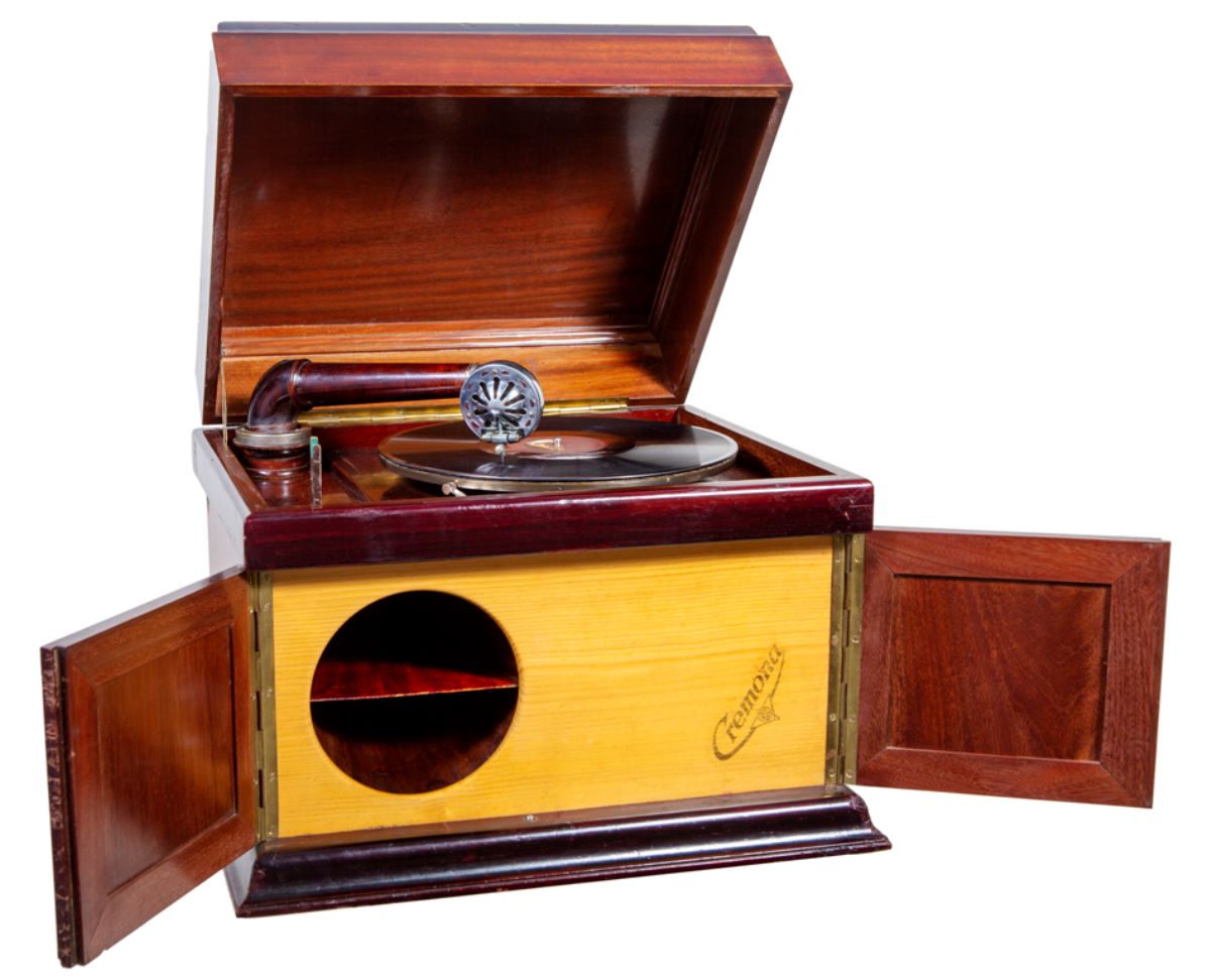 Descriere: Patefonul este un model de masă confecționat din lemn de mahon lăcuit, furniruit. Modelul conține pavilion acustic interior (sau cutie de rezonanță), prevăzut cu două ușite prinse în balamale, delimitat frontal prin intermediul unui plăci din placaj, vopsită în culoare galbenă, pe care este inscripționat ”Cremona”. Brațul acustic lărgit este montat pe bile și terminat cu diafragma ce conține acul. Capacul superior al cutiei este susținut de un braț metalic mobil, amplasat în partea stângă. Mecanismul de rotire al platanului este compus din două arcuri și este montat în interiorul cutiei. Aparatul conține indicator de viteză, pârghia de pornire-oprire a mecanismului cu arcuri ce produce rotația platanului cu disc. Nu conține cutiuțe pentru păstrat ace de rezervă. Lateral-dreapt, exterior, se află manivela pentru armarea arcurilor. Suportul de înregistrare a sunetului este discul din ebonită. Starea de conservare este bună, aparatul fiind în stare de funcționare.