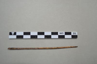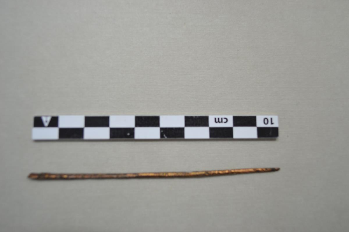 Descriere: Ac de cusut. Rupt la ambele capete. Ac aplatizat la partea superioară.